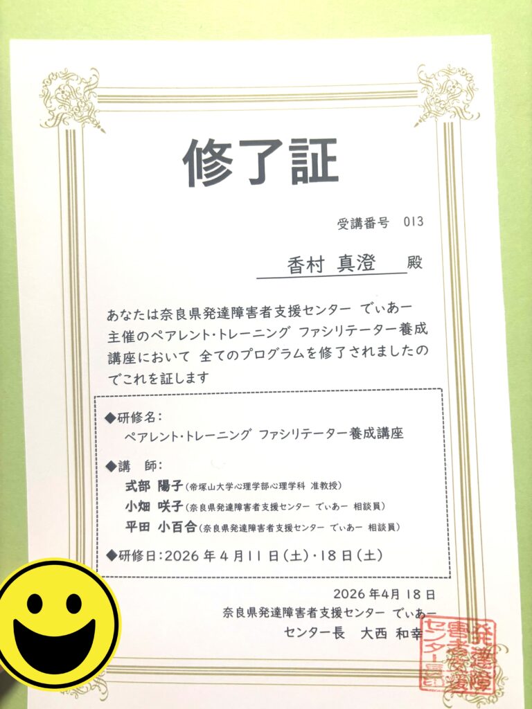 その第一歩として、4月11日、18日の2週にわたり、香村は「ペアレント・トレーニング ファシリテーター養成研修」に参加してきました。